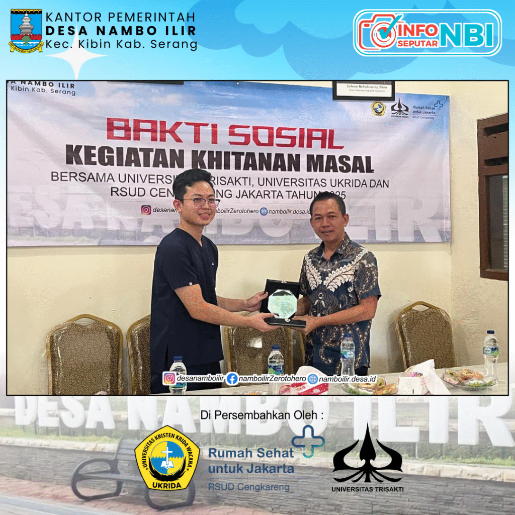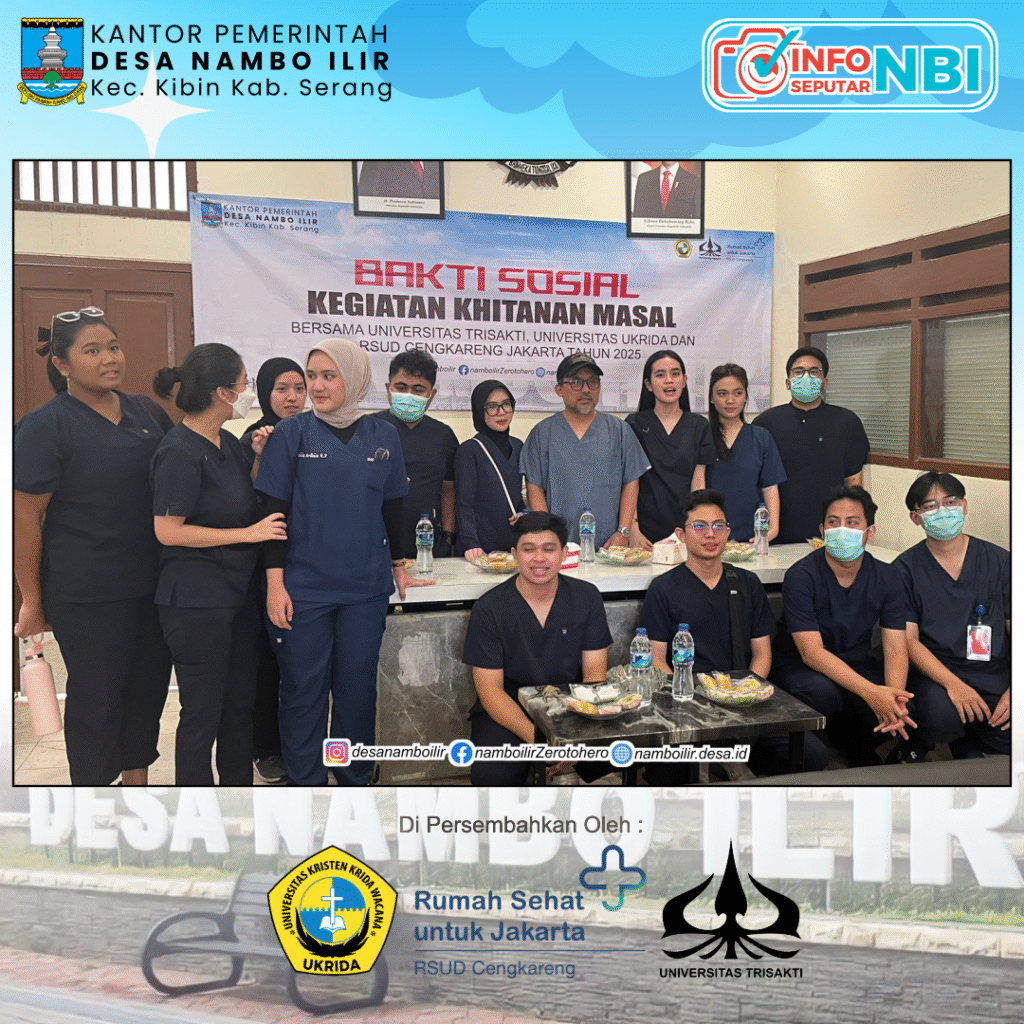 Nambo Ilir, Sabtu 11 Oktober 2025 — Pemerintah Desa Nambo Ilir kembali menunjukkan komitmennya terhadap pelayanan kesehatan masyarakat melalui kegiatan Khitanan Massal yang digelar di Poskesdes Nambo Ilir. Kegiatan ini terlaksana berkat kerja sama antara Pemerintah Desa Nambo Ilir dengan Fakultas Kedokteran dan Ilmu Kesehatan Universitas Kristen Krida Wacana (Ukrida) dan Universitas Trisakti, serta RSUD Cengkareng, Jakarta.